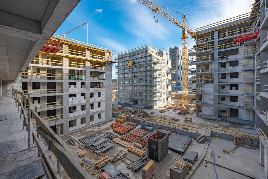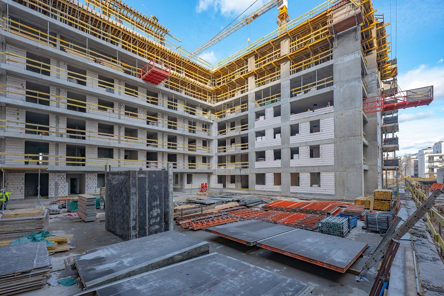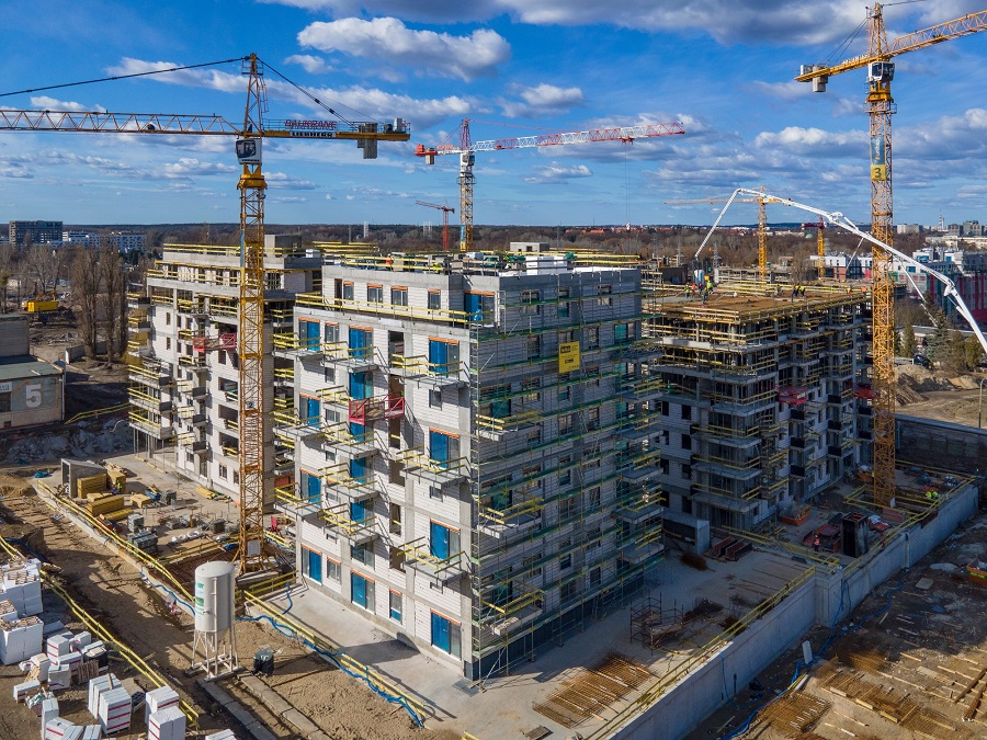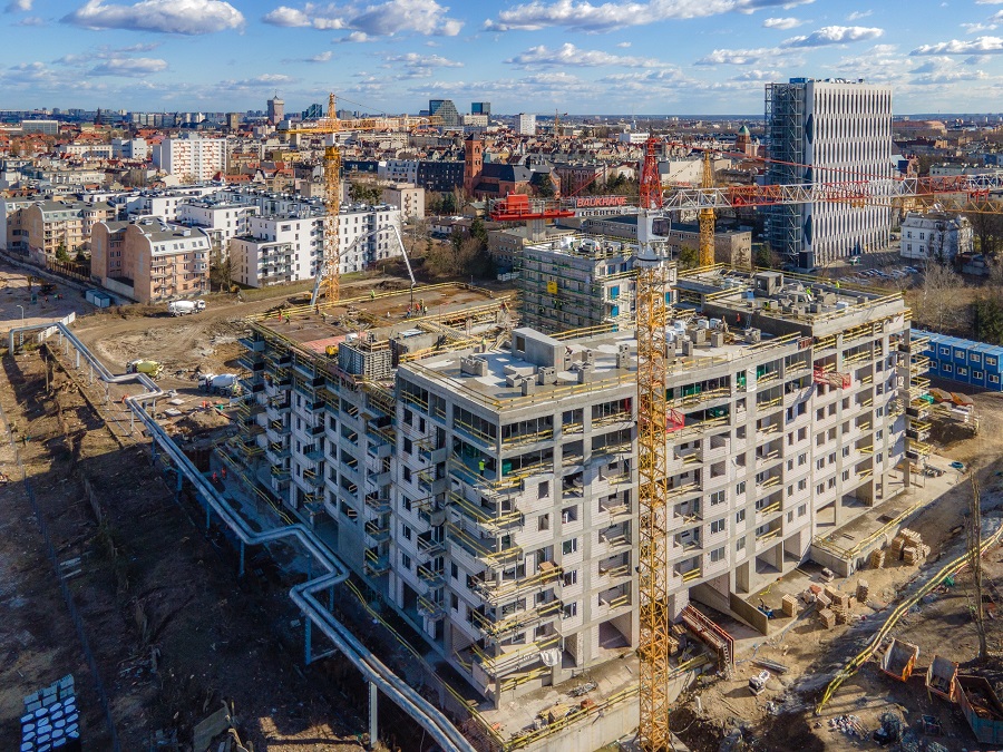 Powstaje ostatni fragment siódmego piętra większego budynku. Równocześnie na niższych kondygnacjach trwają prace murarskie oraz montaż okien.