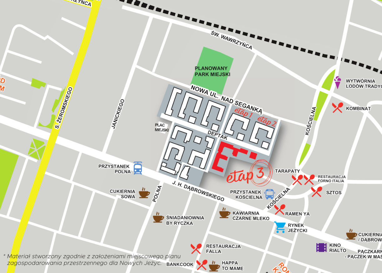 Pierwszy etap osiedla realizowany jest w północnej części działki. Wjazd na teren osiedla odbywać się będzie od strony ulicy Kościelnej poprzez nowo wybudowaną ulicę Nad Seganką. Stąd już prosta droga do fantastycznych jeżyckich knajpek czy pięknych, sołackich parków!